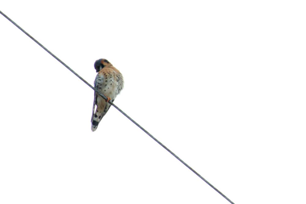 After an hour, I ended my robin photo shoot and started walking back. I noticed a bird on a telephone line that looked quite different than the now very familiar silhouette of a robin. I got closer, aimed my camera and realized I was looking at a raptor.