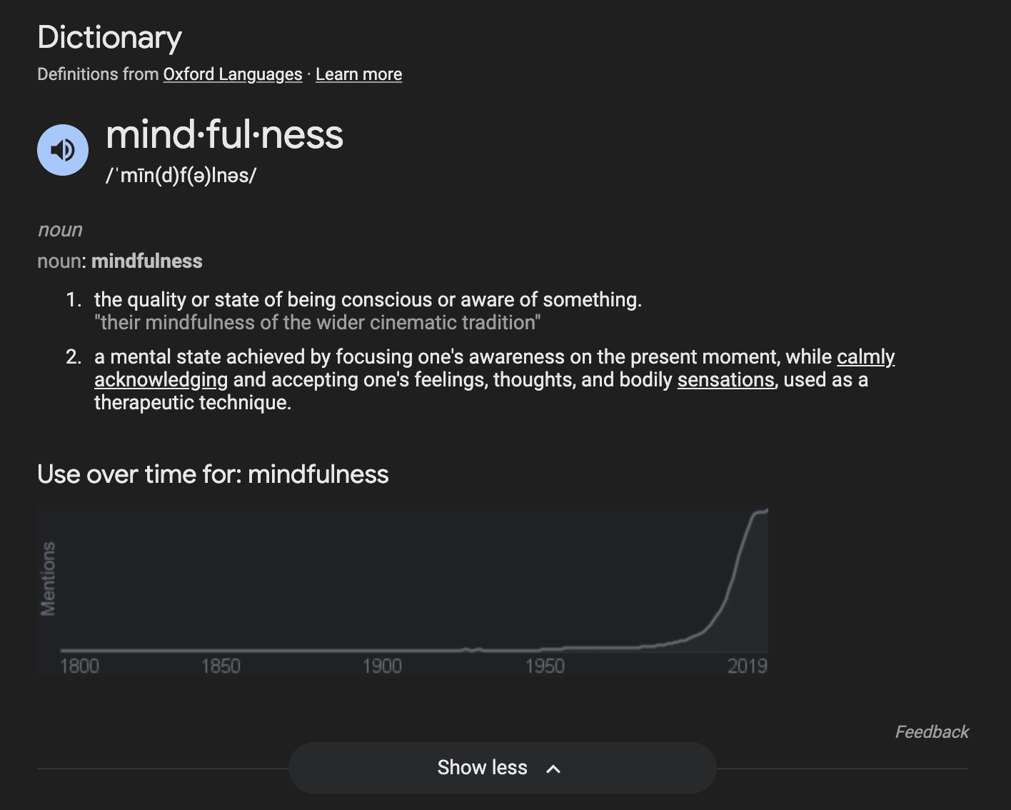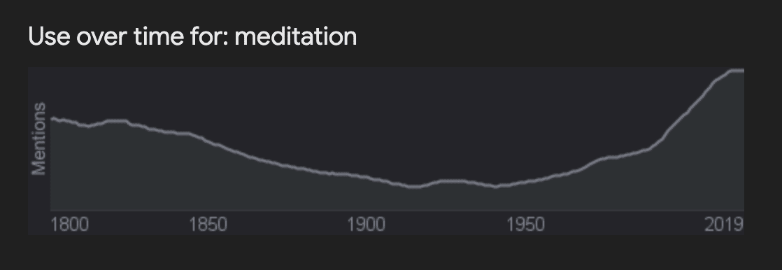 Meditation and mindfulness have received a lot of public attention in recent years. Even just the “mentions” charts for the terms in Google seem to line up perfectly with my personal experience hearing the words in both media and normal social communication: