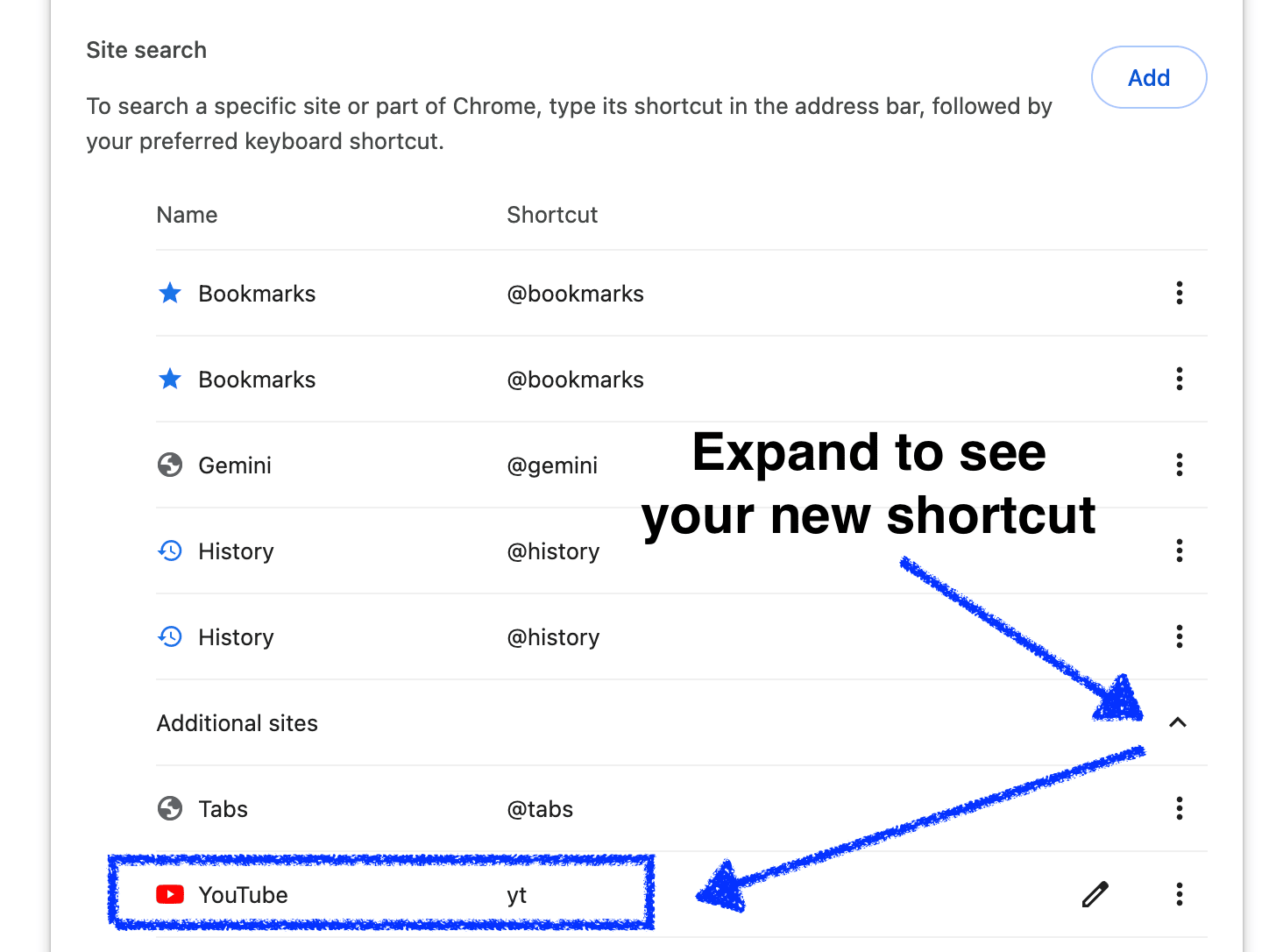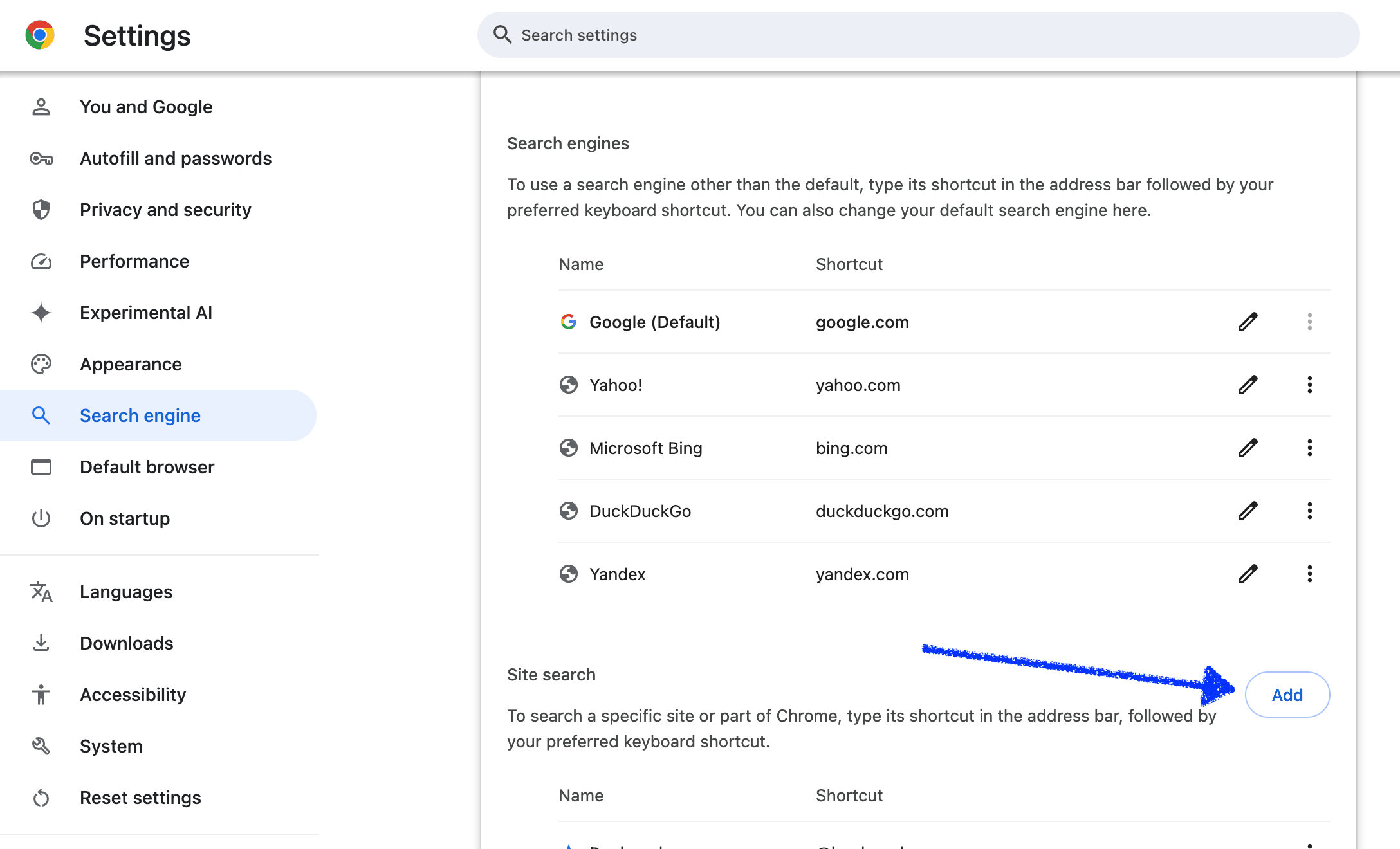 Click the "Add" button inside/near the "Site Search" section. We're going to set up a search shortcut so that you can quickly search YouTube without having to go to the site, find the search bar, and type in your search.