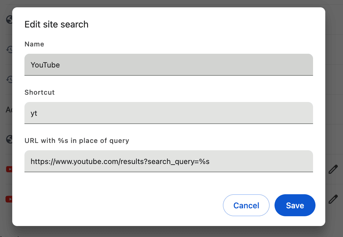 Shortcut: yt (this can be whatever you want to type in the URL bar for this shortcut)