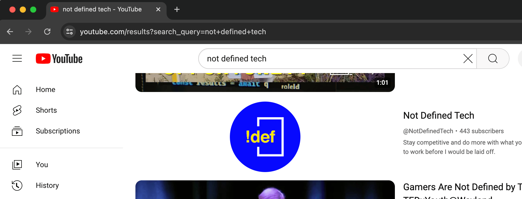 Say you're looking for my YouTube channel, so you go to YouTube and search for not defined tech. You'll be sent to this URL: