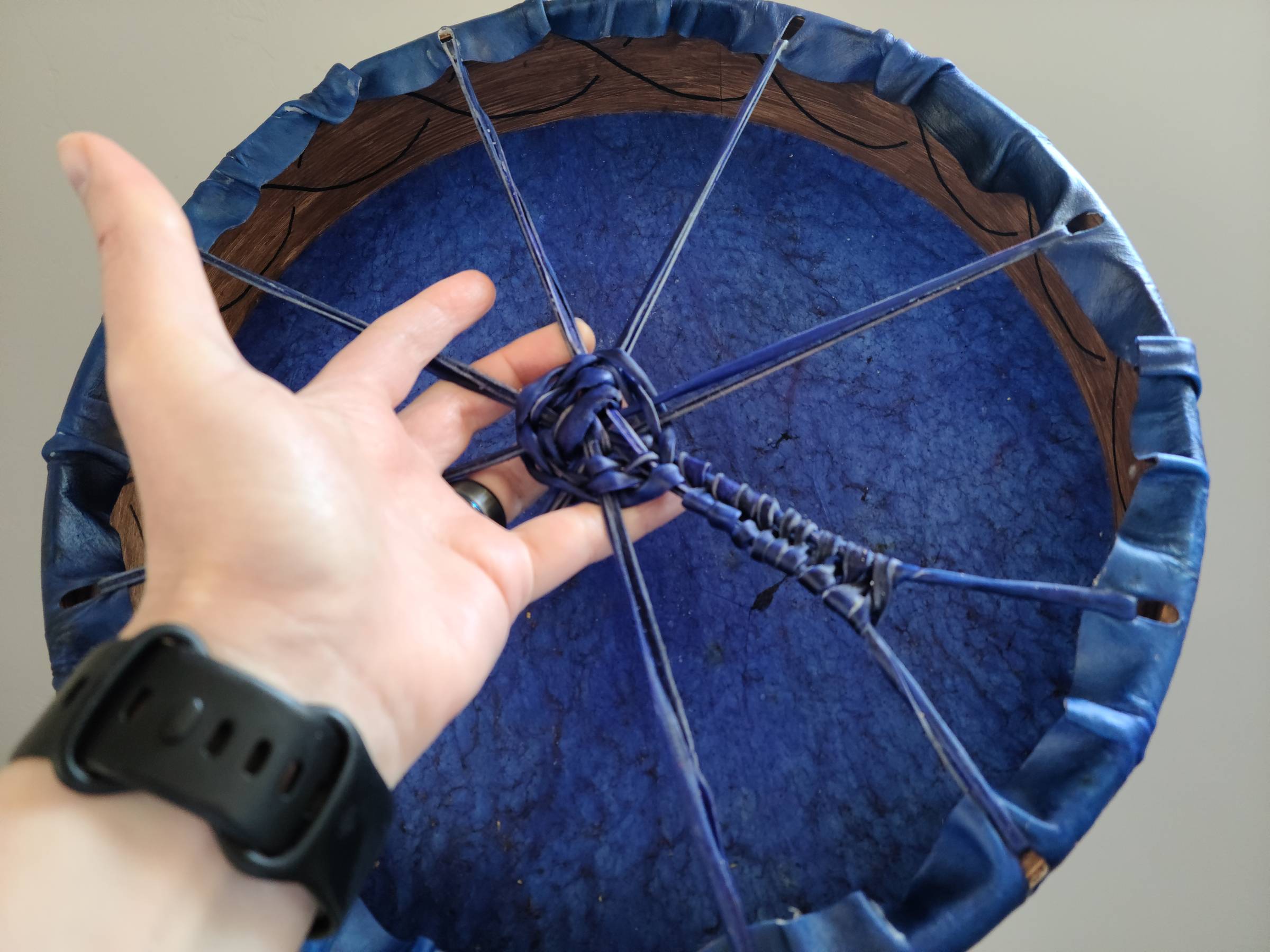 This was the best part of the class: getting yet another culture's perspective of this wu wei concept. The hide of the deer told me a story: it has scars and bumps and spots that showed through the dye. In a way, the animal still had some say in its transformation from hide to drum. It didn't matter how hard I pulled, there were parts that would not lie perfectly flat or curve the way I wanted. After stringing and tensioning the back, I discovered that the hide had a natural hole on the edge (as opposed to the pre-punched holes from processing), meaning I had nine lines instead of the expected eight.