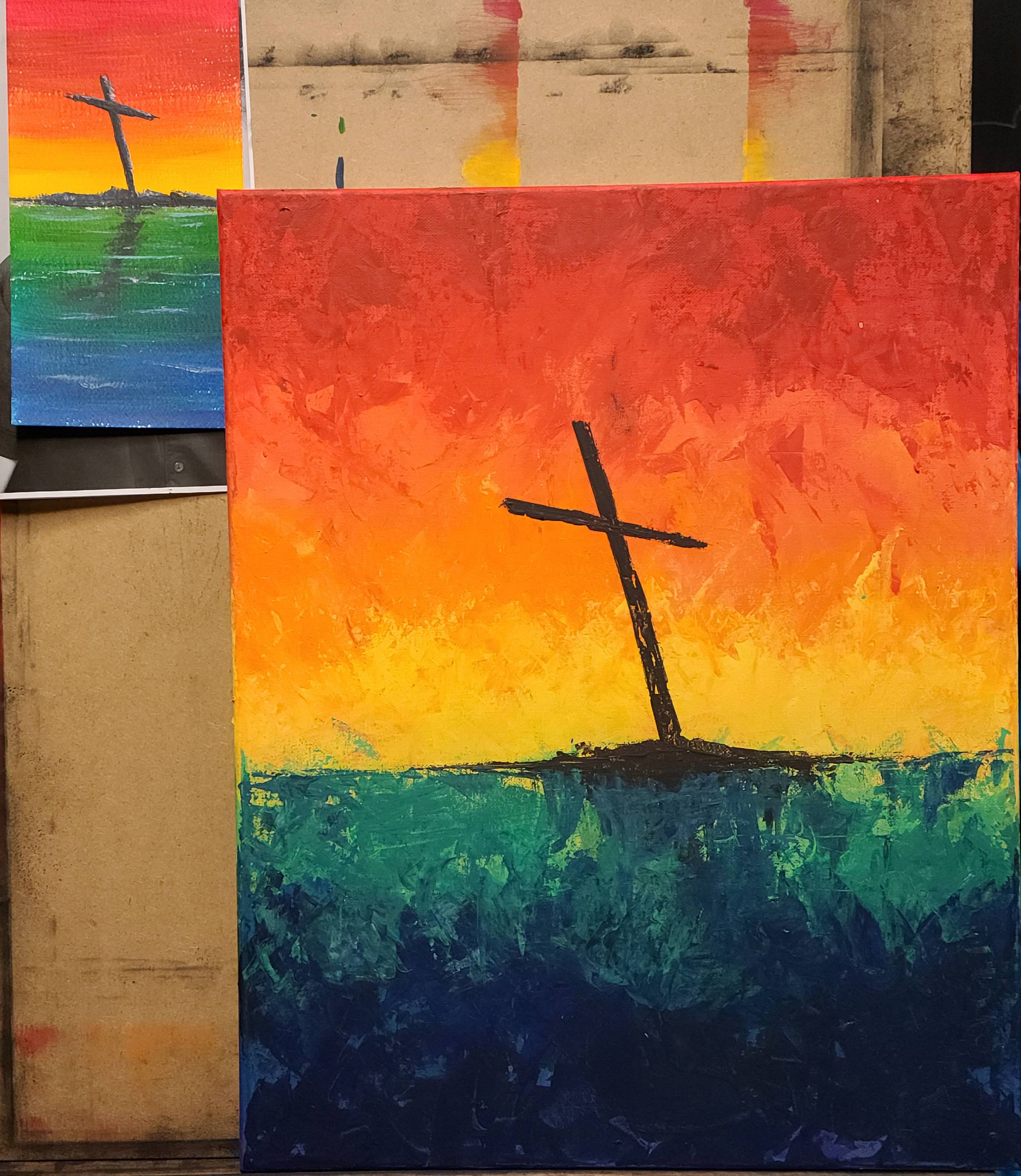 For the last year, the ghost of a prior failure haunted me every time I went into my garage. This particular phantom was a canvas that I had messed up while painting. It had a beautifully blended rainbow background, starting at the top with a deep crimson, melding into orange and yellow, then somewhat sharply changing to green, then blue, and a hint of indigo at the bottom. The idea was to depict a sunset over water, so that my Pride-flag colors could be projected onto a somewhat natural scene. The only flaw was that the transition to the "water" surface got a little too abrupt with a few misplaced strokes of green that were too high to make it appear intentional, and too dark to hide under another coat of yellow.