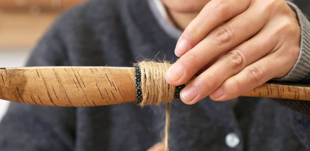 Just for my sake, I'll highlight this other technique of using twine to help bind the soft shagreen to the curved surface near the handle. I love rope and string, and therefore I love the idea of using it as a way to help clamp something to a non-squared surface.