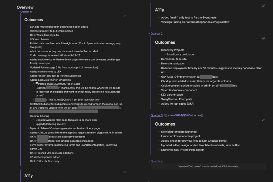 I take my notes in Obsidian, but any software will work (just make sure you follow any policies your company may have). I've stolen an idea from a YouTuber, whose name I've long forgotten (sorry), but I've made some changes to his original system to be a little easier to report and track things throughout the quarter and the year.