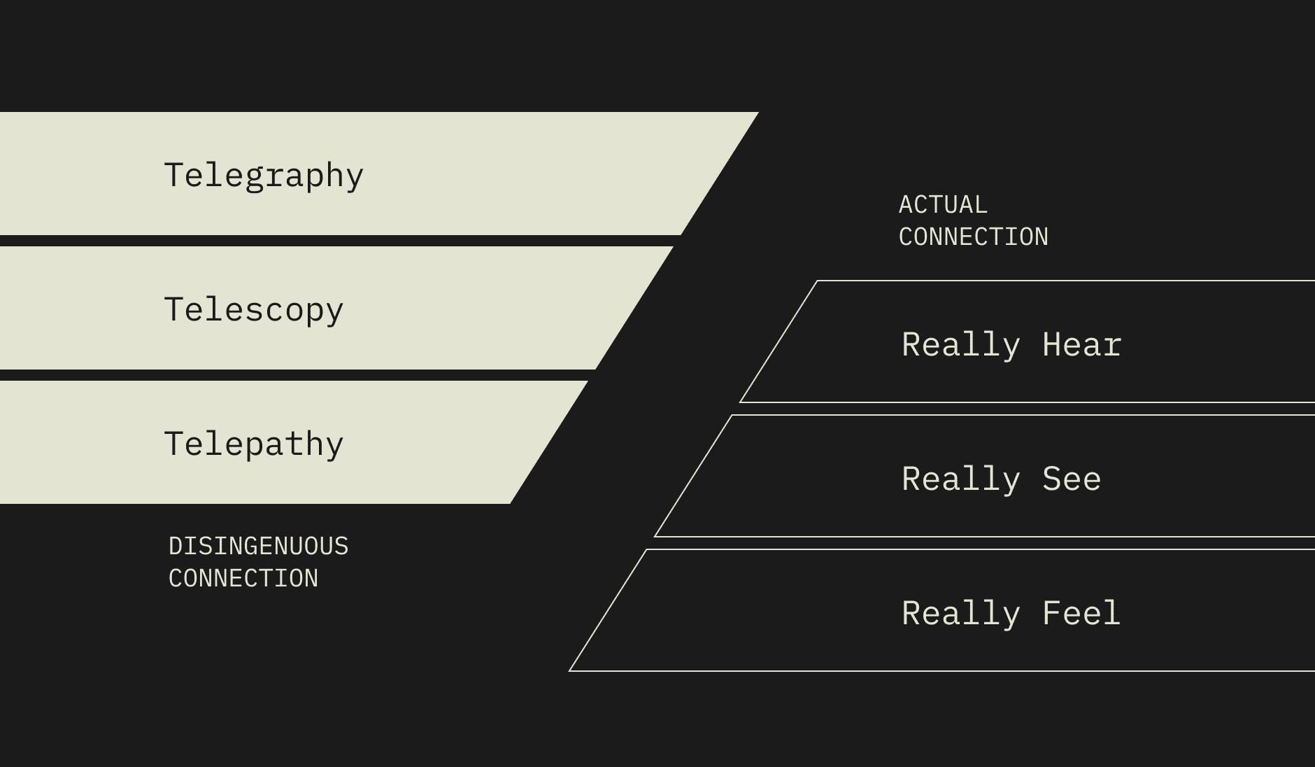 All of these "from afar" abilities stand in contrast to the difficult work of real human relationships. Genuine, honest, healthy relationships between people require that we really hear each other (up close), really see each other (up close), and really feel with others (again, up close). Both companies and AI never really hear people (they write to them, they speak to them), they never really see people (they watch them, they drive them), and they will never feel with people (there is always an agenda, a goal). Their abilities to do things from afar will never compare to what humans can do for each other up close—but it will become trickier to remember and discern this as AI improves and is wielded against you.